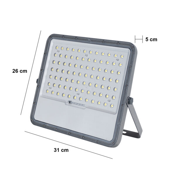 Proyector LED Solar 2100 Lm Luz Fría Control Remoto te permite iluminar exteriores con luz fría que podrás regular en intensidad y horas gracias a su control remoto incluido. Es ideal para uso exterior por su IP 65 resistente a la intemperie, agua, polvo etc con una alta estabilidad recomendado en estacionamientos, bodegas, casa, estadios, seguridad y más. Este proyector funciona con un panel de energía solar que cuenta con una duración de 10 a 12 horas máximo ahorrando hasta el 100% de la energía, además no requiere cables para su instalación e incluye anclajes. Cuenta con un control remoto que cumple con las funciones de: ajuste de hora, control de la luz, brillo completo y modo de brillo medio. Sus medidas son: 31 x 5 x 26 cms.